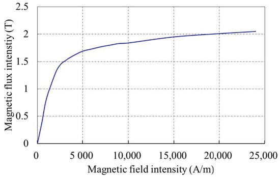 A finite element analysis method [22] was used to verify the spatial distribution model that was proposed in Section 2. The model consisted of a current-carrying coil and a pipe segment. The current-carrying coil was arranged on the inner wall of the pipe with a current density I of 10 A, and a diameter of 10 cm. The length, inner diameter, and wall thickness of the pipe were 6 m, 35 cm, and 2 cm, respectively. The values of the parameters that were used in the FEM model are shown in Table 1. The B-H curve of the pipe model is shown in Figure 4. The outside of the pipe was set to air, the air permeability is μ0 = 4π × 10−7 N/A2, and the pipe magnetic permeability was generated during the magnetization simulation.