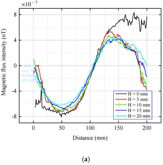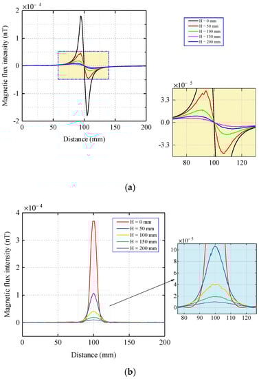The coordinate origin O in Figure 5a is taken as the center, where point O coincides with the center of the coil and scans along the y-axis direction. To show the change of the magnetic signal propagation more intuitively, the image display data are a solution of y = −100–100 mm. The magnetic flux intensity components under different lift-off values of H are shown in Figure 6.