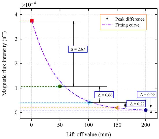 From Figure 9, it can be concluded that for the case where the stress concentration zone is located at the bottom of the inner wall, the normal component decays with increasing propagation distance, and the change in the peak difference with a propagation interval of 5 cm is relatively flat. By fitting the peaks with the Levenberg–Marquardt algorithm, it can be seen that the peak decay of the flux intensity follows an exponential law with an increase in the lift-off value.