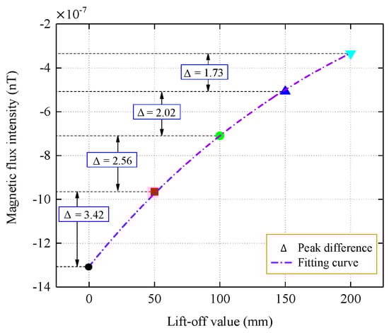 Table 2 lists the peak values of the tangential and normal components of the magnetic flux intensity. To better analyze the attenuation and distribution characteristics of the signal, the peak differences of the normal components of the magnetic flux intensity that were detected at different lift-off values were compared, and the lift-off values differences were all 5 cm, as shown in Figure 7.