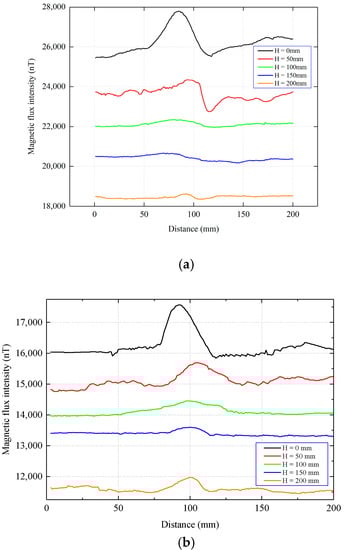 Experimental measurement of the magnetic flux intensity at different lift-offs. (a) Tangential component. (b) Normal component.