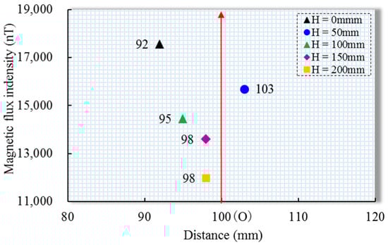 The position where the peak value of the normal component that was measured in the experiment appears, as shown in Figure 12, is the difference between the peak distance that was measured in the experiment and the peak position of the theoretical data (horizontal axis 100 mm) under different lift-offs can be intuitively seen. The maximum difference was 8%, indicating that the distribution model of the magnetic flux intensity at the top was reliable.