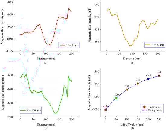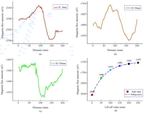 Tangential components and the peak curve of the magnetic flux intensity at different lift-offs. (a) Normal components when H is 0 mm. (b) Normal components when H is 50 mm. (c) Normal components when H is 150 mm. (d) Peak and fitting curve.