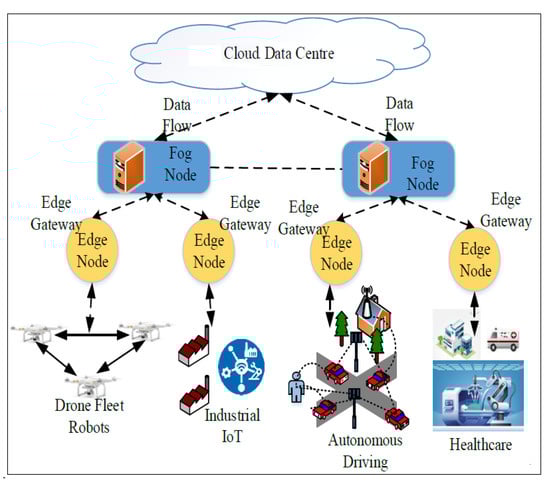 Edge computing refers to a broad set of techniques designed to move computing and storage out of the remote central cloud (public or private) and closer to the source of data []. It exists to increase the computational capacity of the network. Supposedly, the next generation networks may support the connection density of more than 1 M devices/km2. The introduction of a large number of devices in the networks hinders the processing of a large amount of data within low latency [].