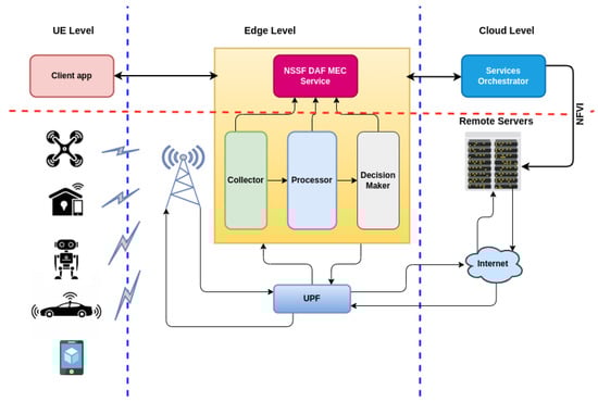Figure 3 provides an overview of our proposed framework for NS selection. NSSF DAF consists of a solution in which a part is executed on user equipment (e.g., smartphones, vehicles, IoT brokers), running as a transparent service and another one runs at the edge of the network operator or service provider. The framework has several modules that can be configured according to the context of applications, geographic location, scenarios of mobility, strategies of slices selection, and others. For energy saving, the user equipment only signals its consumption profile or user application preference to the framework hosted at the edge of the architecture. Hence, no processing occurs in the mobile device or in the IoT broker.