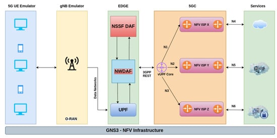 Thus, a new approach that employs techniques aimed at the integration and interoperability between RAN or Open Radio Access Network (O-RAN), Edge and Core networks, based on an efficient and robust Slice Selection service (virtual network selection), under an architecture that provides compatibility with the standards specification in progress, is a promising solution for 5G mobile networks. It is also applicable to various segments, such as the integration of a large amount of data from devices linked to the IoT context (e.g., smart homes, patient monitoring, Wireless Sensor Networks—WSNs) with cloud services; integration of applications that have multimedia requirements, high density of video and audio traffic, such as applications that use Virtual Reality (VR) and Augmented Reality (AR) technologies; provision of specialized networks with sophisticated slice selection and security mechanisms to provide services for autonomous vehicle networks in different models and topologies (e.g., V2V—Vehicle-to-Vehicle, V2I—Vehicle-to-Infrastructure, V2X—Vehicle-to-Everything) [,,].