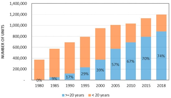 A regular building inspection and condition assessment have been deemed as a necessary measure to maintain the functionality and integrity of buildings and civil infrastructures. Since there is an increasing number of old buildings, the exposure of façades persistently experiencing adverse outdoor environmental conditions catalyses the degradation []. The percentage of public residential buildings in Singapore exceeding the age of 20 years was 74% [] (see Figure 1). The city has reported more than 90 incidents in the past three years where parts of the façades fell off. It is expected that more and more façade defects and incidents of falling objects from heights will incur, leading to serious public safety issues []. As such, structural health monitoring is becoming an indispensable inspection task during façade condition assessment as falling objects from tall buildings can cause potential damage to the public and trigger structural safety considerations []. Periodic monitoring and building inspections are necessary to rationally secure the safety of building components []. This leads to the necessity of new knowledge about the types and characteristics of façade falling objects, the critical factors affecting the falling and the effectiveness of various inspection techniques.