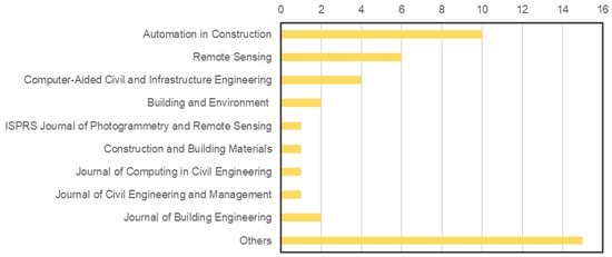 Figure 2 shows the overall picture of the articles, whereas Figure 3 presents the number of articles among the different research themes. The journals Automation in Construction, Remote Sensing, Computer-Aided Civil and Infrastructure Engineering, Building and Environment, ISPRS Journal of Photogrammetry and Remote Sensing, Journal of Computing in Civil Engineering, etc. have been found to publish more papers in this field. The amount of publications had a considerable increase over the past few decades. It can be argued that there is a growing interest in façade inspection and maintenance as the number of publications continues to increase. The literature retrieved was further analysed regarding the methods, techniques and algorithms for façade defect detection and diagnosis. Details of the findings are presented in the following sub-sections.