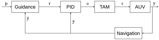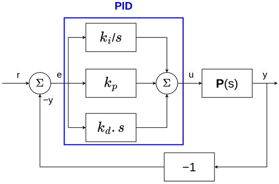 As shown in Equation (1), the PID controller takes its name from the fact that it computes the input u proportionally to three distinct terms—the tracking error (representing the past), the integral of the tracking error (representing the present), and the derivative of the tracking error (representing the future). The block diagram in Figure 2 shows a typical PID controller in the frequency domain (with the use of Laplace transforms), without guidance and navigation components.