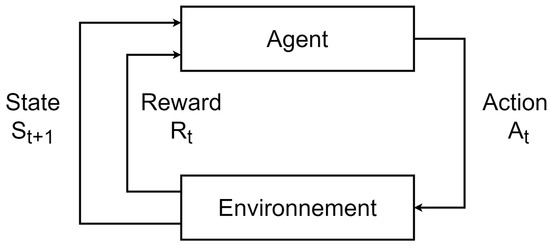 A MDP is represented on the Figure 3. At time step t, the agent is in a given state of the environment and performs an action . The state and the action can be the vectors. The environment responds to the agent by sending to it an observation of the new state and a scalar signal called the reward . The role of the reward is to judge the actions carried out by the agent with respect to the states of the environment. If the reward is positive, the action is good to carry out in the given state to complete the task; otherwise, it is a bad action to perform and it moves the agent away from its goal. The tuple is called a transition in the vocabulary of MDPs.