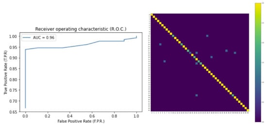 The results obtained by applying the CNN-LSTM model described in Section 5.2 are shown in Table 1. It can be noted that this model, applied to masked subjects belonging to the M2FRED dataset, achieves a precision of 0.96 and a recall, f1-score, and accuracy of 0.95. In Figure 6, the ROC curves and the Confusion Matrix show good behavior of the method for the classification task.