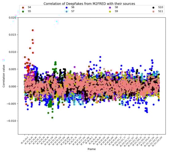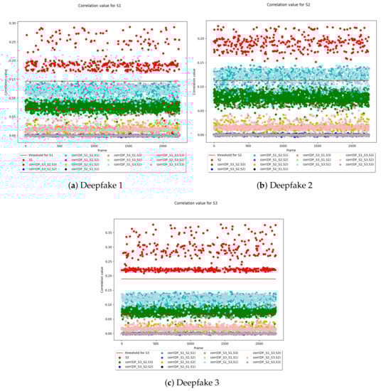 For example, in Figure 8a, all the correlations carried out have been performed against the RP of camera S1. The experiment confirmed that all the correlation values of the RN from unmodified frames are positioned above the red line (the red points) when related to the source camera. All the other correlation values are always below the threshold because either the frames come from an artificial video (produced by AI) or the frames have been produced by a different camera.