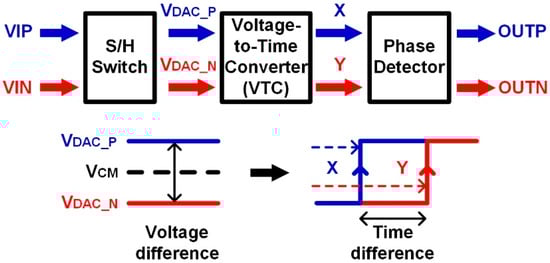 With advances in wireless sensors and the Internet-of-Things (IoT), the demand for low-power analog-to-digital converter (ADC) designs has increased. The simplest low power design technique is supply voltage reduction. However, at low supply voltage, the operation speed of the circuit is limited, and the signal-to-noise ratio (SNR) is worse because the signal power decreases as the supply voltage is lowered. With the development of CMOS process technology, a successive approximation register (SAR) ADC is widely used since it is a digital-friendly structure [,,,,,,]. However, conventional comparators with supply voltages of less than 1 V also struggle to meet the noise requirements, such as SNR in an SAR ADC. For noise scaling, the majority voting scheme was introduced []. It uses additional comparisons for critical decisions to suppress noise. However, the additional comparison cycles limit the sampling rate of the ADC. A time-domain comparison technique can be also a good choice to reduce the input-referred noise [,,,,]. Figure 1 shows the scheme of a time-domain comparator in an ADC. The voltage-to-time converter (VTC) is composed of a voltage-controlled oscillator (VCO) or a voltage-controlled delay line (VCDL). In the time-domain comparator, the VTC generates two pulse signals (X and Y) with different delays according to different control voltages, VDAC_P and VDAC_N, which are analog inputs from a sample-and-hold switch (S/H switch). The phase detector then compares the time difference to determine the input voltage difference. The time-domain comparator is made of digital logic circuits, therefore, the power consumption can be scaled down and the input-referred noise is suppressed through delay stages. However, since the time-domain comparator requires propagation time to generate delayed signals, the conversion rate is lower compared to a conventional dynamic comparator. In this paper, a low noise asynchronous SAR ADC with dual-domain comparison is presented using a VCDL-based time-domain comparator to suppress noise at sub-1 V supply voltage and a double-tail dynamic comparator to increase the conversion rate. To optimize the conversion rate and the power consumption, an asynchronous timing controller is introduced. This paper is organized as follows. Section 2 explains the proposed SAR ADC using a dual-domain comparator and discusses the core and sub-blocks with design and implementation. Section 3 shows the measurement results and finally, the conclusion is described in Section 4.