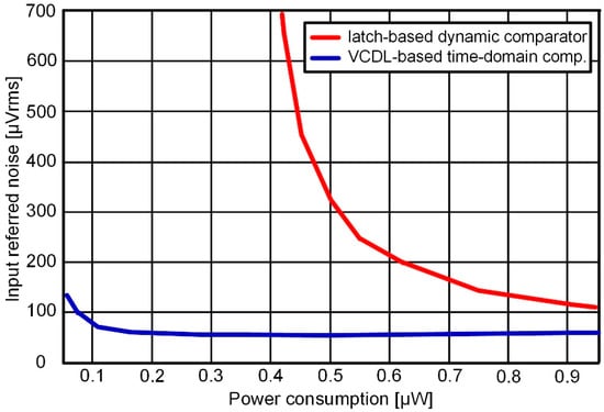 Figure 3 shows the input-referred noises of a latch-based dynamic comparator and a VCDL-based time-domain comparator according to power consumption. The input-referred noise of the latch-based dynamic comparator decreases as the size of the input transistor increases. On the other hand, the input-referred noise of the VCDL-based time-domain comparator decreases as the delay stage increases. According to simulation results, the latch-based dynamic comparator requires high power consumption of 0.9 μW or more to reach the input-referred noise level of the VCDL-based time domain comparator used in this design.