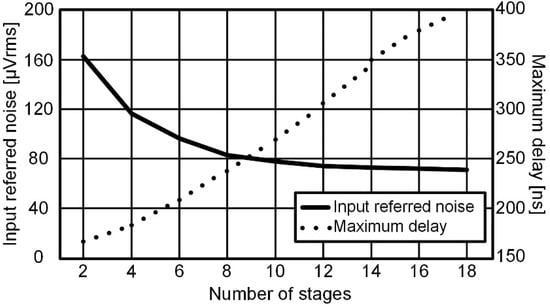 The VCDL consists of N-stage NMOS-gated and PMOS-gated current-limiting delay units. The voltage-to-time gain by N-stage delay units increases the standard deviation of random noise and offset, so the input-referred noise and offset are reduced by the number of stages []. The simulated number of stages versus VCDL maximum delay and the input-referred noise is shown in Figure 5. The maximum delay of the VCDL is a propagation delay from ACT_T to X or Y. As the number of stages increases, the maximum delay also increases but the input-referred noise is inversely proportional to the square root of N. In this work, the number of stages has been determined in consideration of the input-referred noise and the conversion speed. In Figure 5, the input-referred noise decreases from 79.8 μVrms to 74.4 μVrms from 10-stages to 18-stages. However, the maximum delay increases almost linearly from 2-stages to 18-stages. The maximum delay of the VCDL has been set to 247.3 ns and the input-referred noise is set to 79.8 μVrms with 10 stages.