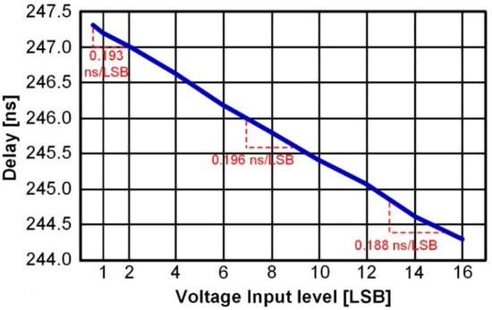 For the linearity of the proposed ADC, the voltage-to-time gain of VCDL in the time-domain comparator should be considered. Since a VCDL-based time-domain comparator is used for 3 LSB comparisons, voltage-to-time conversion linearity must be guaranteed up to 8 LSB of voltage input level. Figure 6 shows the voltage-to-time performance of the VCDL from input voltage levels 0.5 LSB to 16 LSB. As shown in Figure 6, the voltage-to-time gain from 0.5 LSB to 2 LSB is 0.193 ns/LSB, from 7 LSB to 9 LSB is 0.196 ns/LSB, and from 14 LSB to 16 LSB is 0.188 ns/LSB. The maximum gain error is 5.53% and the average voltage-to-time gain from 0.5 LSB to 16 LSB is 0.199 ns/LSB.
