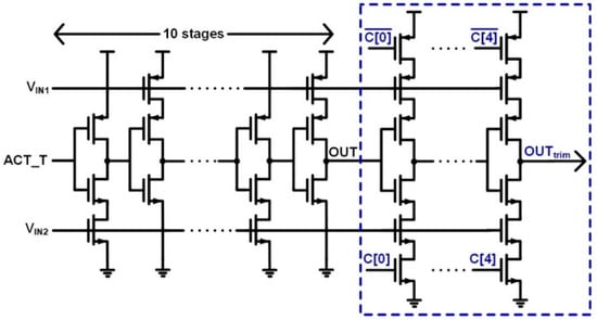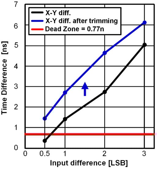 In the VCDL-based time-domain comparator, the dead zone of PD is also important. If the time difference between the X and Y of each VCDL output does not exceed the PD dead zone due to voltage-to-time gain variation, it causes metastability. According to post-layout simulation results, best-case and worst-case dead zones of the PD are 0.58 ns and 0.77 ns, respectively and the time difference of the two VCDL outputs becomes shorter than the dead zone of 0.77 ns when the input voltage difference is 67 mV (0.11 LSB). To compensate for the dead zone violation due to the voltage-to-time gain variation, trimming transistors are added to the VCDL-based time-domain comparator as shown in Figure 7. Transistors with delay cells with a trimming option are designed to be 4 times larger than delay cells in 10 stages. When the trimming option is selected, the output of the VCDL-based time-domain comparator is switched from OUT to OUTtrim. The voltage-to-time gain of VCDL is adjusted using trimming code C [4:0]. As shown in Figure 8, the time difference between X and Y of each VCDL output becomes greater than the dead zone of 0.77 ns by trimming the voltage-to-time gain. In this work, the VCDL is designed to change the minimum X–Y time difference from 0.32 ns to 1.48 ns at the input voltage difference of 0.5 LSB.