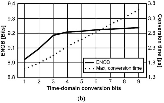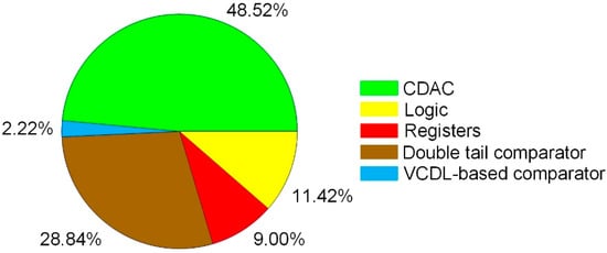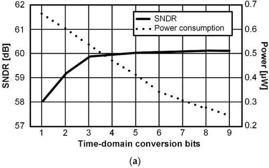 The double-tail dynamic comparator can achieve fast data conversion and high input noise immunity with a large regenerative current of the latch stage, but it causes high power consumption []. On the other hand, the VCDL-based time-domain comparator can reduce the input-referred noise and offset with low power consumption for high SNR, but its conversion rate is relatively low due to delay stages. Therefore, the bit ratio of coarse and fine conversions for 10-bit output must be determined to achieve both fast conversion and high SNR with lower power consumption. Since the VCDL only needs to output logic data of 0 or 1, the transistor of the VCDL is designed to be smaller than that of the double-tail dynamic comparator. In addition, the VCDL operates at up to 247.3 ns per cycle, and the double-tail dynamic comparator operates at about 50 ns per cycle. As shown in Figure 9a, as the number of bits of fine conversion by the VCDL-based time-domain comparator increases from 1 bit (only D0) to 9 bits (D8~D0) in 10-bit conversion, the total power consumption of the dual-domain comparator decreases from 0.68 μW to 0.25 μW since the double-tail dynamic comparator consumes 0.12 μW and the VCDL-based time-domain comparator consumes 0.02 μW at the minimum differential input of 1 LSB. In addition, as the number of bits of fine conversion by the VCDL-based time domain comparator increases, the SNDR is also enhanced from 58.1 dB to 60.23 dB. Therefore, as the VCDL-based time-domain comparator converts more bits in the 10-bit conversion, the noise characteristics and the power performance are improved.