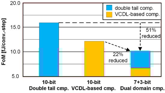 Figure 9b shows the simulated ENOB and the maximum conversion time according to the number of bits for the time-domain conversion. As the number of bits for the time-domain conversion increases, ENOB increases from 8.96 to 9.23. However, a long conversion time of 300 ns or more is required due to the maximum delay of the VCDL-based time-domain comparator and the DAC settling time. Therefore, the number of conversion bits by the time-domain comparator is proportional to the ENOB but inversely proportional to the conversion speed. According to simulation results, as the fine conversion bits by the time-domain comparator increase from 2 bits to 4 bits, the simulated FoMs are 12.3 fJ/conv., 10.2 fJ/conv., and 11.6 fJ/conv., respectively. Therefore, the proposed SAR ADC has been designed with 7-bits for coarse conversion and 3-bits for fine conversion. Figure 10 shows the simulated FoM according to the comparator types. The 10-bit ADC with a single double-tail dynamic comparator has a high conversion rate of 1000-kS/s but the FoM is 20.91 fJ/conv. due to the reduction in the SNDR at the low supply voltage. On the other hand, the 10-bit ADC with a single VCDL-based comparator has a high SNDR but the FoM is 13.17 fJ/conv. due to the low conversion rate of 250-kS/s. In this work, the proposed ADC with a dual-domain comparator has an FoM of 10.2 fJ/conv. which is reduced by 51% compared to the single double-tail dynamic comparator by optimizing conversion rate, SNDR, and power consumption.