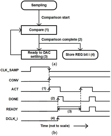 (a) Architecture of the proposed SAR ADC; (b) Timing diagram of the proposed SAR ADC.