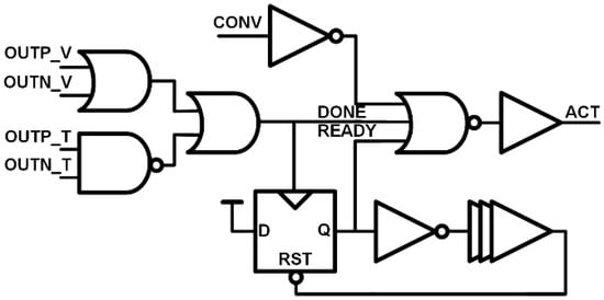 In the synchronous SAR logic, a clock period is determined by the critical DAC settling time or the comparator conversion time. In this work, since the double-tail dynamic comparator and the VCDL-based time-domain comparator show different conversion times, an asynchronous timing controller is designed to optimize the operation timing of the dual-domain comparator. Figure 11 shows the state and timing diagrams of the asynchronous timing controller. First, when the CLK_SAMP goes low, the CONV for performing the comparison goes high. The CONV triggers ACT and the ACT goes high (1). When the comparator completes the bit decision, the DONE goes high (2). The READY is for DAC settling time and is triggered by the DONE signal (3). When the READY goes low, the ACT goes high, and the next bit comparison is performed. In the SAR logic, the DONE triggers the DCLK_i which stores the decision bit in the DAC register and converts the DAC switch (4). The schematic of the asynchronous timing controller is shown in Figure 12. The outputs of the double-tail dynamic comparator, OUTP_V and OUTN_V are low and the outputs of the VCDL-based time-domain comparator, OUTP_T and OUTN_T, are high in the idle state. Therefore, the DONE is generated with OR and NAND logic. The DONE signal implies that each comparator’s conversion is complete, so each comparator must be reset quickly. In particular, the VCDL-based time-domain comparator has a large propagation delay, so if the node of each stage is not reset quickly, it causes incorrect results in the next comparison. Therefore, when the DONE becomes high, the ACT becomes low immediately through NOR logic and resets each comparator. The next bit comparison is automatically started as the ACT goes high when the D-flip flop has been reset by the delayed READY signal.