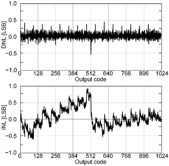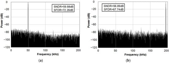 The proposed SAR ADC has been fabricated in 180-nm CMOS technology. The die microphotograph of the proposed SAR ADC is shown in Figure 13. The proposed ADC occupies 1130 μm × 740 μm and operates at a supply voltage of 0.6 V with a 400-kS/s sampling rate. The measured dynamic performances are shown in Figure 14. As shown in Figure 14a, the measured SNDR and SFDR are 59.88 dB and 72.26 dB at the 400-kS/s sampling rate with 50 kHz input frequency, respectively. For a Nyquist input with 195.3125 kHz, as shown in Figure 14b, the measured SNDR and SFDR are 65.69 dB and 56.59 dB, respectively and the ENOB is 9.16 bits. Many spurs occurred in the FFT due to the linearity error of the S/H switch. The measured DNL and INL of the proposed SAR ADC are shown in Figure 15. The maximum errors of DNL and INL are +0.47/−0.53 LSB and +0.92/−0.64 LSB, respectively, which are caused by the parasitic capacitances of capacitor-to-capacitor connections. Figure 16a shows the SNDR and SFDR level trends according to various input frequencies at a 400-KS/s sampling rate. The SFDR decreases from 72.26 dB to 67.74 dB as the input frequency increases from 50 kHz to 200 kHz. The SNDR also decreases from 59.88 dB to 56.89 dB, which is caused by the linearity error of the S/H switch and the parasitic-induced symmetric mismatch of DAC at the 0.6-V supply voltage. Figure 16b depicts the ENOB trend of the proposed SAR ADC with a 400-kS/s sampling rate. The maximum ENOB of the proposed SAR ADC is 9.56 bits at an input frequency of 50 kHz. As increasing the input frequency to be 195.312-kHz, the ENOB becomes 9.16 bits. Figure 17 shows the power breakdown of the proposed SAR ADC. At a 400-kS/s sampling rate, the measured total power consumption is 2.36 μW and the ADC core achieves an FoM of 10.31 fJ/conv. The S/H circuit and the CDAC consume 48.52% of the total power. The dual-domain comparator consumes 31.06% and digital circuits, including the SAR logic, the asynchronous timing controller, and registers, consume 20.42%. Table 1 summarizes the performance of the proposed SAR ADC compared to [,,,,].
