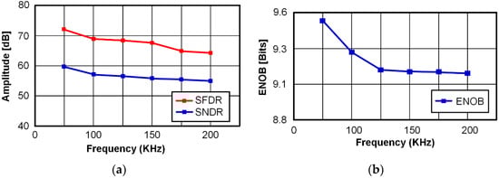 (a) SFDR and SNDR versus input frequency at 400-kS/s sampling rate; (b) ENOB trend of the proposed SAR ADC with various input frequencies at 400-kS/s sampling rate.
