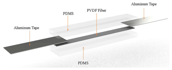 Figure 1. The intermediate layer is a PVDF fiber film and the upper and lower layers are PDMS film material. A pair of aluminum sheets are attached to the PVDF fiber film to form aluminum electrodes. The aluminum electrodes will output the voltage signal generated by PVDF fiber film. Therefore, when the self-powered strain sensor is subjected to external forces, and this leads to bending, PVDF fibers can come under axial stress and produce strain to convert into electrical energy. Afterward, the voltage is generated when the PVDF fiber is affected by an external force. Using these voltages, the sensor can become a self-powered strain sensor, so no additional battery device is required.