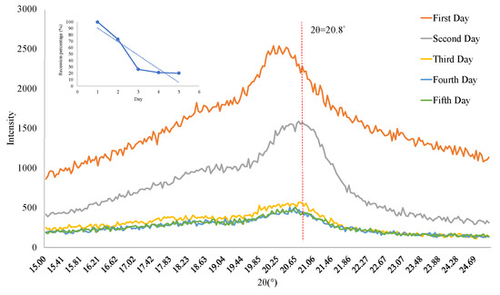 Figure 6, but the peak at 20.8° will fade with time, so the piezoelectric element is time-bound. Therefore, to explore the impact of time on PVDF fiber, the downward trend at the value of 20.8° for the XRD spectrum of the piezoelectric element manufactured using NFES technology can be assessed. After more time, it can be found that the peak of 20.8° exhibits a fading trend; the peak of the first day is the highest, the peak of the third day begins to fade to 20% of the first day, and the falling amplitude begins to approach saturation.