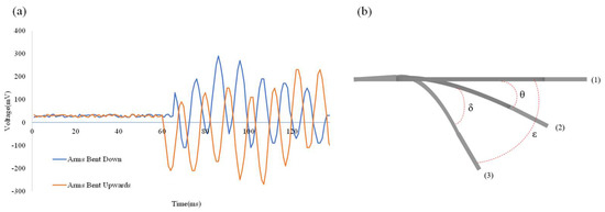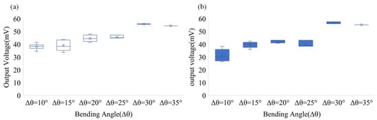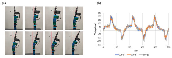 Figure 12a, when the robotic arm is bent downward, the output voltages generated by each bending angle are different. When the variation angle Δθ = 10°, the output voltage of the self-powered strain sensor is 38.2 mV; when the variation angle Δθ = 15°, the output voltage is 39.12 mV; when the variation angle Δθ = 35°, the output voltage is 54.4 mV. Similarly,