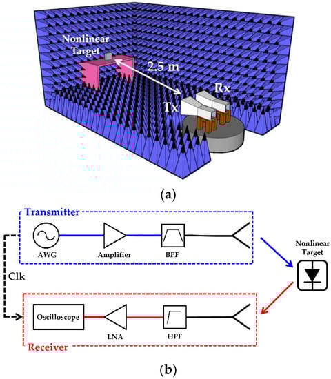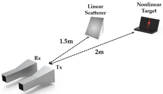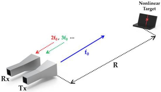 To overcome this limitation of linear radars, “nonlinear” detection was proposed in the 1970s []. Due to the nonlinearities of electronic components and circuit elements in electronic devices, it is possible to separate small electronic devices of interest from linear scatterers, even in the presence of strong clutter and other objects with large RCS. Unlike linear radars, nonlinear radars use different transmit and receive frequencies. That is, by tuning the receiver to only receive the nonlinear responses (harmonic or intermodulation) that are excited by the nonlinear interaction at the semiconductor junctions in electronic devices, nonlinear radars allow for the detection of electronic devices in the probed environment []. Since natural linear scatterer and responses from other non-electronic objects do not produce nonlinear responses, it is possible to eliminate the linear response and only receive the desired nonlinear response from electronic devices. This allows for the effective detection of small electronic targets that would otherwise be difficult to achieve with linear radars [,,,,,,,]. Nonlinear radars can be utilized in various applications. For military and security purposes, they can be used to detect concealed electronic devices [,]. They have also been applied for detecting vital signs for health monitoring [,,] and insect tracking using harmonic tags [,,,].