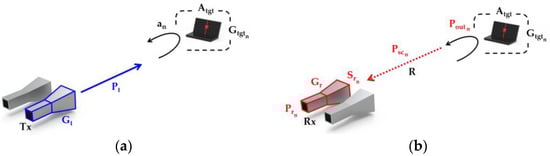 The first term in Equation (2) describes the transmitted power density incident at the target. The second term is the “apparent RCS” which refers to the apparent size of the target that is perceived by the radar []. Note that  is changed to  to indicate the apparent RCS. The third term represents the free space spreading loss. The last term describes the effective aperture of the Rx antenna. Hence, the total received power  is the product of the abovementioned terms.