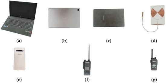 Various sizes of electronic targets that were used for measurement: (a) laptop, (b) tablet PC 2, (c) tablet PC 1, (d) diode-terminated antenna, (e) cell phone, (f) radio 2, and (g) radio 1.