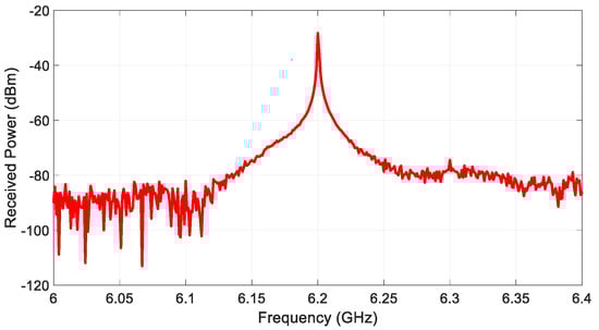 Figure 4 shows an example of the received power of harmonic response,, from one of the targets (i.e., laptop). It can be seen that −32.04 dBm is received at the second harmonic frequency of 6.2 GHz. Table 1 summarizes the types and physical cross–sections of the selected nonlinear targets and the received power level of the harmonic responses of each target.