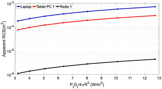 For a given target with , the apparent RCS can vary depending on the incident power level as indicated in Equation (9). To validate this, we obtain the values of  at different incident power density levels  by varying  for three targets with the largest, middle, and smallest . Figure 5 shows the values of  for these targets at a distance of 2.5 m at three different incident power density levels, where it can be seen that the value of  indeed increased for all the targets as  increases.