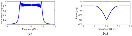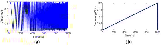 where  is the start frequency set at 3 GHz and  is the chirp rate defined as . Here,  is set at 200 MHz and  is set to have a chirp duration  of 1 μ s. Figure 7 shows the transmit FMCW waveform that is generated from Equation (18) for one chirp duration. In the transmit mode, s(t) is repeatedly transmitted in a continuous manner.