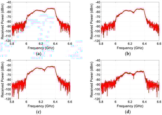 The second harmonic FMCW responses are measured for the electronic devices with various sizes as listed in Table 1. The time delay in the received harmonic responses includes not only the delay due to the target distance, but the delays that are caused by the system such as cable, filters, etc. Hence, it is essential for accurate target detection to separate unwanted time-delay from the total delay. In order to remove the system time-delay, a calibration measurement is performed before taking the target measurements. Figure 8 shows the spectrum of the received harmonic responses scattered from the targets that were measured. It can be seen that each target response is spread over 6–6.4 GHz, which is the second harmonic band of the transmit waveform. Also, the received power level of the target responses decreases in a similar manner to their nonlinear RCS in relation to their size, as expected. Note that the power levels that are shown in Figure 8 may seem lower since they include the total cable loss of about 12 dB in the measurement setup. The plots in Figure 8 are to show that detection of target responses was properly achieved in the measurement.
