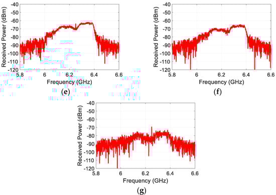 Amplitude spectrum of the measured target responses. (a) laptop, (b) tablet PC 2, (c) tablet PC 1, (d) cell phone, (e) diode-terminated antenna, (f) radio 2, (g) radio 1.