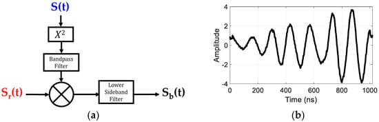 In the FMCW radar, the range information is obtained from the beat signal, , which is extracted by mixing the transmit and receive signals. The beat frequency occurs due to the time delay between the transmit and receive frequencies that is caused by the target distance. Here, we perform the mixing through signal processing by multiplying the transmit and receive signals and filtering out the lower band. For the second harmonic FMCW radar that was considered here, the frequencies of the transmit signal must be doubled to match the bandwidth with the received signals before mixing. Figure 10 illustrates the process of extracting the beat signal and shows an example of the extracted beat signal from a measured target response. After extracting the beat signals, the Fourier Transform of  is taken, which provides a compressed target echo, and the target distance information can be calculated by using the following relationship: