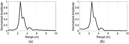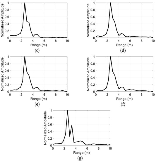 Figure 11 shows the compressed echo as a function of the range for the measured targets. Since the range is fixed at 2.5 m for all the targets, the peak of the Fourier Transform of the beat signals occurs at 6.82 MHz, which is approximated to be 2.57 m using Equation (19). The detected range seems to be in a good agreement with the actual target range of 2.5 m.