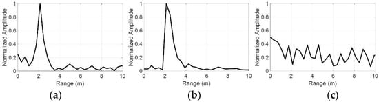To test the proposed nonlinear radar’s ability to suppress linear scatter, the detection measurements were carried out with nonlinear targets in the presence of a linear scatterer. Figure 12 illustrates the measurement setup where the laptop and diode-terminated antenna are used as nonlinear targets and a rectangular metal plate (19 cm × 22 cm) as a linear scatterer. Here, the metal plate is located at a distance of 1.5 m from the antennas, and the nonlinear targets were placed at a distance of 2 m from the antennas. The received signals are processed in the same manner as described in Section 4.2, which can be seen in Figure 13. Figure 13a,b, respectively, show the compressed target echo of the laptop and diode-terminated antenna that were measured in the presence of the metal plate, as a function of the range. The peak of the Fourier Transform of the beat signals occurs at 5.66 MHz, which approximately corresponds to 2.12 m. The detected range seems to be in good agreement with the actual range of 2 m of the nonlinear targets. On the other hand, there is no peak that occurs around 1.5 m, indicating that the linear scatterer is not detected. Figure 13c shows the resulting compressed signal when the metal plate and antenna with an open circuit are present. Note that the antenna with the open circuit is the same antenna as the diode-terminated antenna, but with the diode removed, making it a linear scatterer. In this case, both targets are linear scatterers, resulting in no significant peaks at any of the distances, as expected. The results demonstrate that the proposed nonlinear radar can suppress responses from linear scatterers and detect the nonlinear target of interest in the midst of the linear scatterer.