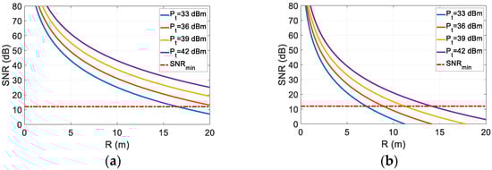 Next, Equation (14) is modified to account for the FMCW radar. To this end, frequency modulation bandwidth and the chirp duration need to be considered, which results in the processing gain (PGR) [], i.e.,: