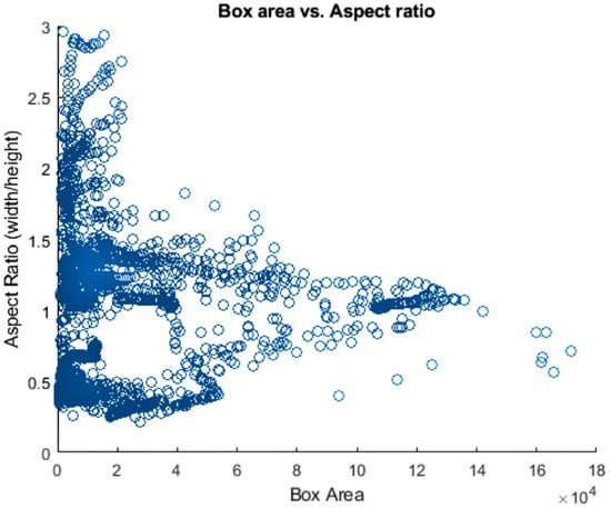 Anchor boxes are important parameters of deep learning object recognition. The shape, scale, and the number of anchor boxes impact the efficiency and accuracy of the object detector. Figure 2 indicates the plot of aspect ratio and box area of the self-recorded dataset.
