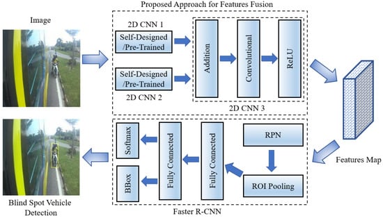 Recently, deep learning techniques prove to be a game changer in object detection. Many deep learning models have been proposed to detect different types and sizes of objects in images [31,32,33]. Among these models, two-stage object detectors show better accuracy compared to one-stage object detectors [34,35,36]. Therefore, two-stage object detectors, such as faster R-CNN [31], seem to be more suitable for blind-spot vehicle detection. In faster R-CNN, a self-designed CNN or a pre-trained network (such as VGG16, ResNet50, and ResNet-101, etc.) is used to extract a feature map [37,38]. These networks are trained on a large dataset and are proven to be better in performance compared to simple convolutional neural networks (CNNs). In medical applications, it has been reported that multi-CNNs performed much better in residual feature extraction and classification compared to single CNNs [39,40,41].