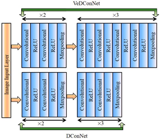 Both DConNet and VeDConNet architectures consist of five convolutional blocks. In DConNet, all five blocks are composed of a two 2D convolutional and ReLU layers. In addition, at the end of each block there is a max-pooling layer. In VeDConNet, the initial two blocks are similar to DConNet as they consist of two 2D convolutional layers, each followed by a ReLU activation function, where a max-pooling layer is also available after the second ReLU activation function. The other three blocks of VeDConNet comprise four convolutional layers, each followed by the ReLU layer and maxpooling layer after the fourth ReLU activation function.