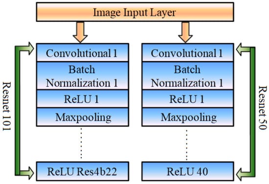 In the second approach, two pre-trained convolutional networks (i.e., Resnet 101 and Resnet 50) are linked with the third CNN architecture, which is further connected with the faster R-CNN network for the purpose of vehicle detection. The features obtained from ReLU Res4b22 and ReLU 40 layers of ResNet 101 and ResNet 50, respectively, as given in Figure 5.
