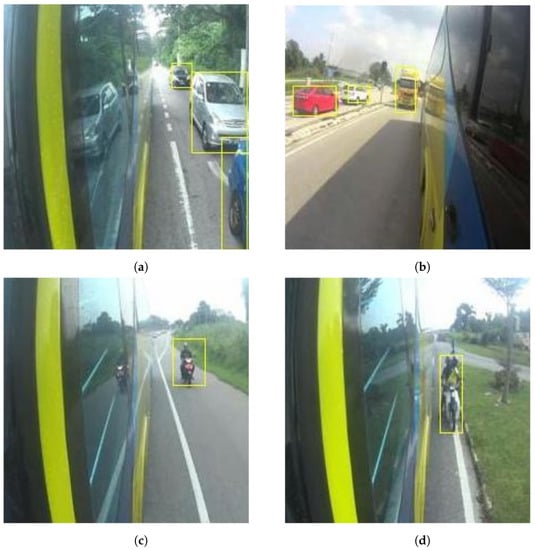 Different types of vehicle detection from self-recorded dataset: (a) three different vehicles in a parallel lane with the bus; (b) one truck in a parallel lane and two cars in the opposite lane; (c) motorcycle at a certain distance; (d) motorcycle very close to the bus.