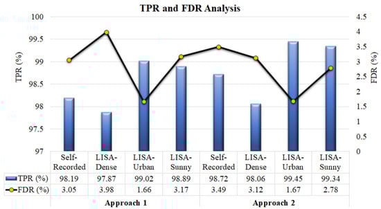 With regard to the comparison between both approaches, the model presented in the first approach obtained a lower FDR compared to the model presented in the second approach for the self-recorded and LISA-Urban datasets. In addition, the model presented in the first approach has a higher frame rate for all the datasets compared to the model presented in the second approach. In other TPR and FDR values, the second approach model outperformed the first approach model. Therefore, there is a slight trade off between performance and computation time.
