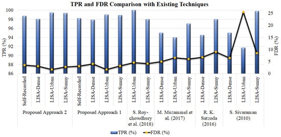 For the online datasets, both approaches obtained either a high or comparable accuracy compared to the existing state-of-the-art approaches, as given in Table 3. For LISA-Dense, the highest TPR value of 98.06% was obtained by the second proposed approach, followed by the first approach with a value of 97.87%. Further, the machine learning approaches proposed by M. Muzammel et al. (2017) [60], R. K. Satzoda (2016) [62], and S. Sivaraman [59] (2010) reported TPR values of 95.01%, 94.50%, and 95%, respectively. S. Roychowdhury et al. (2018) [61] did not report any results for the LISA-Dense dataset. For LISA-Urban, the highest TPR value was obtained by S. Roychowdhury et al. (2018) [61], followed by the proposed second approach. For LISA-Urban, the lowest TPR value of 91.70% was obtained by S. Sivaraman [59].