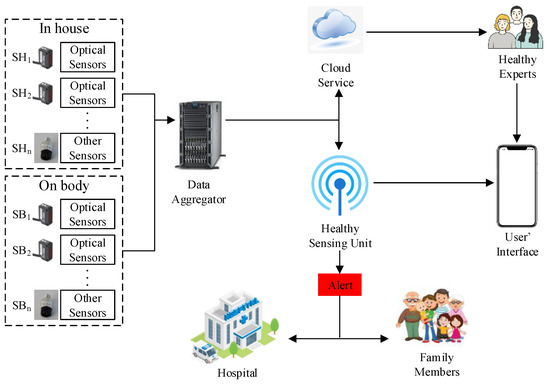 Various sensors, such as blood oxygen, motion tracking, image, and position sensors, are embedded in the framework. Some of the sensors are placed in the user’s living house (e.g., motion tracking sensors). Other sensors are wearable ones. For example, Ma et al. (2022) found that the correlation between strain and optical signals generated by surface wrinkle establishment demonstrates a novel design strategy for wearable optical sensors based on the superb strain sensitivity of the double-layer wrinkle system to surface wrinkles [13]. These sensors collect and provide real-time data to a data aggregator that amalgamates them into a data package with a panel form. The package is transmitted to the cloud and the sensing unit simultaneously. In the cloud, the data are in an online “storage”, containing other users’ information. This process is conducted for each set of sensor values, and the cloud could depict the normal numerical values of each indicator through constant deep learning and comparing. All data packages are stored in the right places under the supervision of regulations and laws.